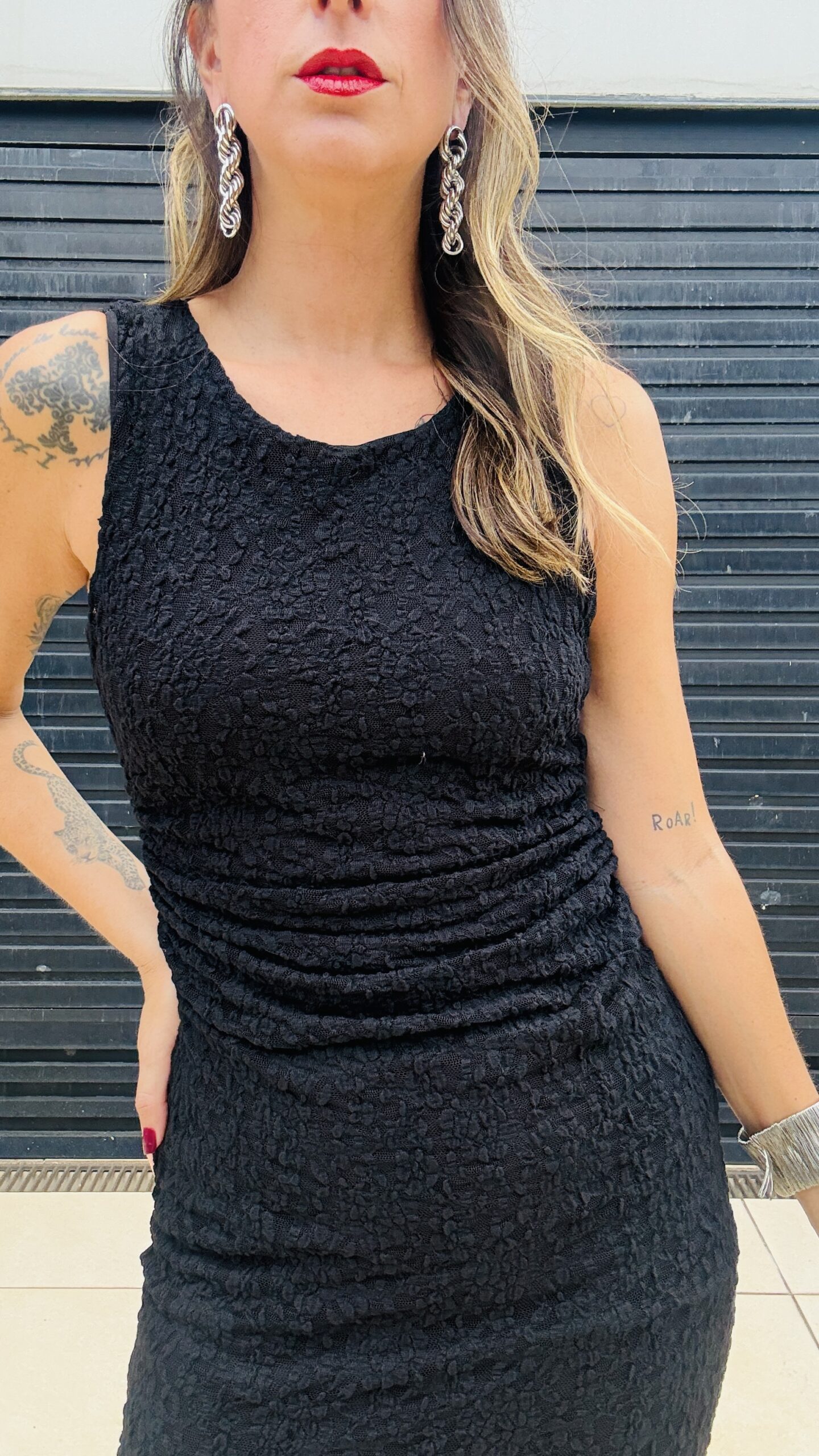 Vestido midi preto em renda com textura rica e acabamento sofisticado. A modelagem ajustada valoriza o corpo de forma elegante, enquanto o comprimento traz equilíbrio e classe.